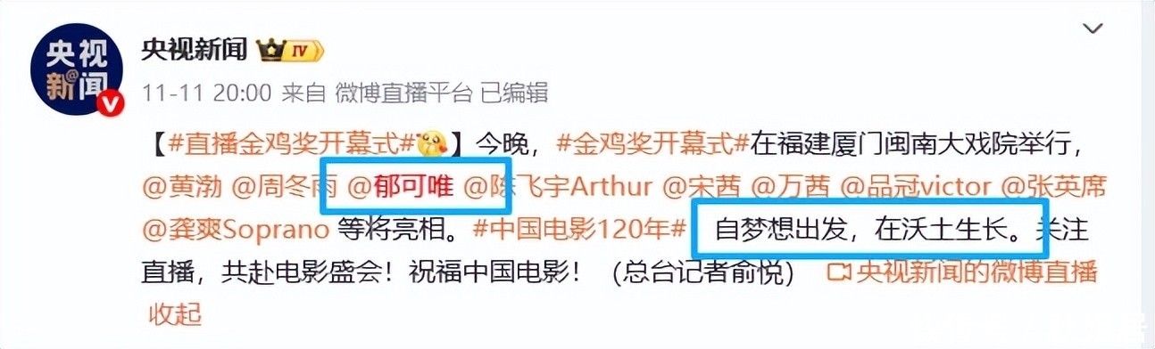 今年十一月,郁可唯作为重要嘉宾亮相金鸡百花电影节开幕式,献唱歌曲《光影人间》。